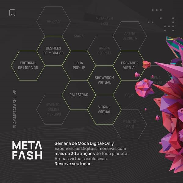 Prepare-se para entrar em uma nova dimensão da moda! Com o propósito de apresentar o universo fashion 3D por diferentes ângulos, a empresa Divaholic organizou o evento virtual METΛFΛSH. Trata-se da primeira semana internacional de moda digital-only do Brasil e da América Latina. A iniciativa ocorrerá em duas etapas: nos dias 25 e 26 de junho, com première acompanhada por desfiles (23/6 – 25/6), na Xtendend, com mais experiências digitais e arenas disponíveis.